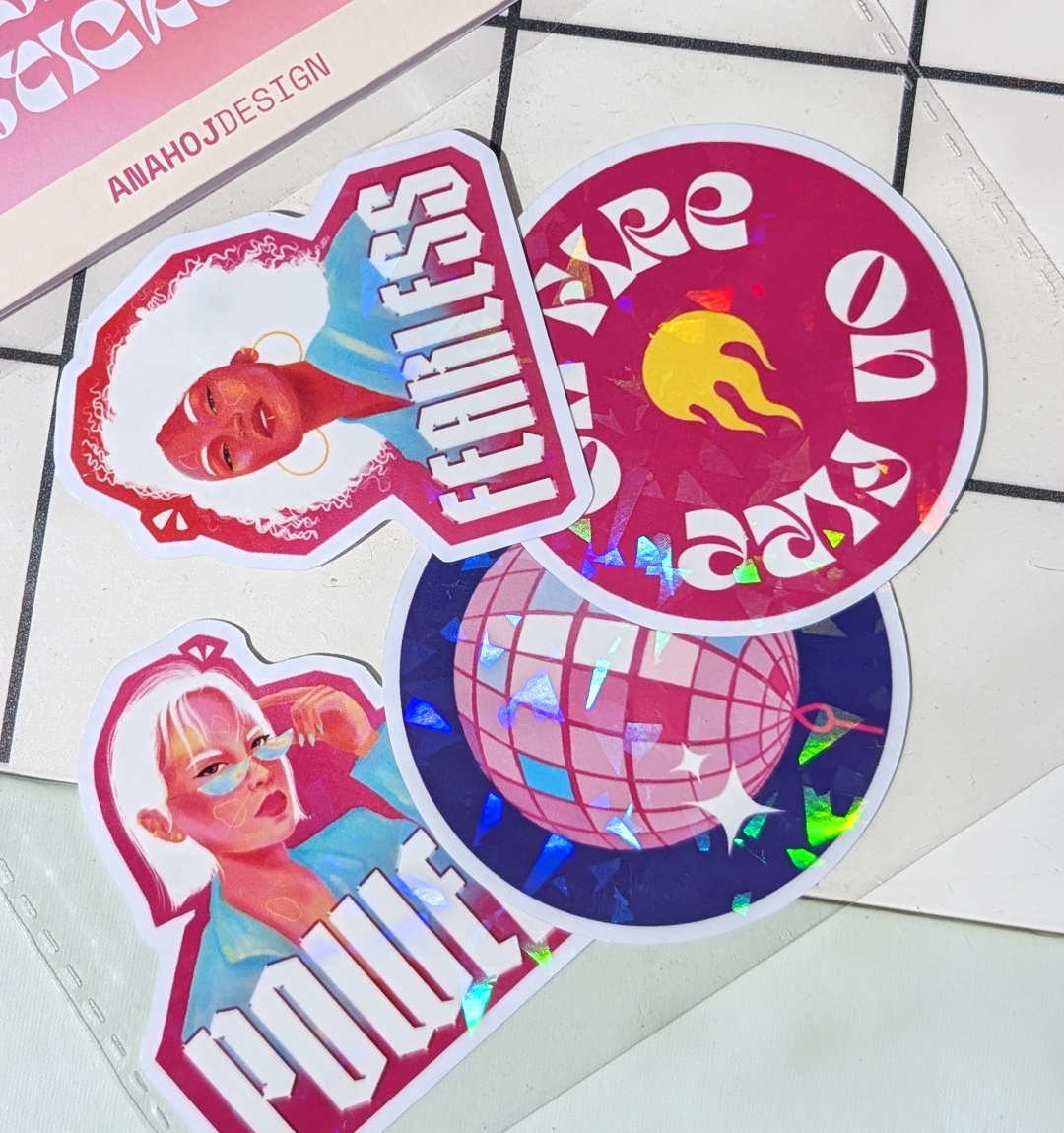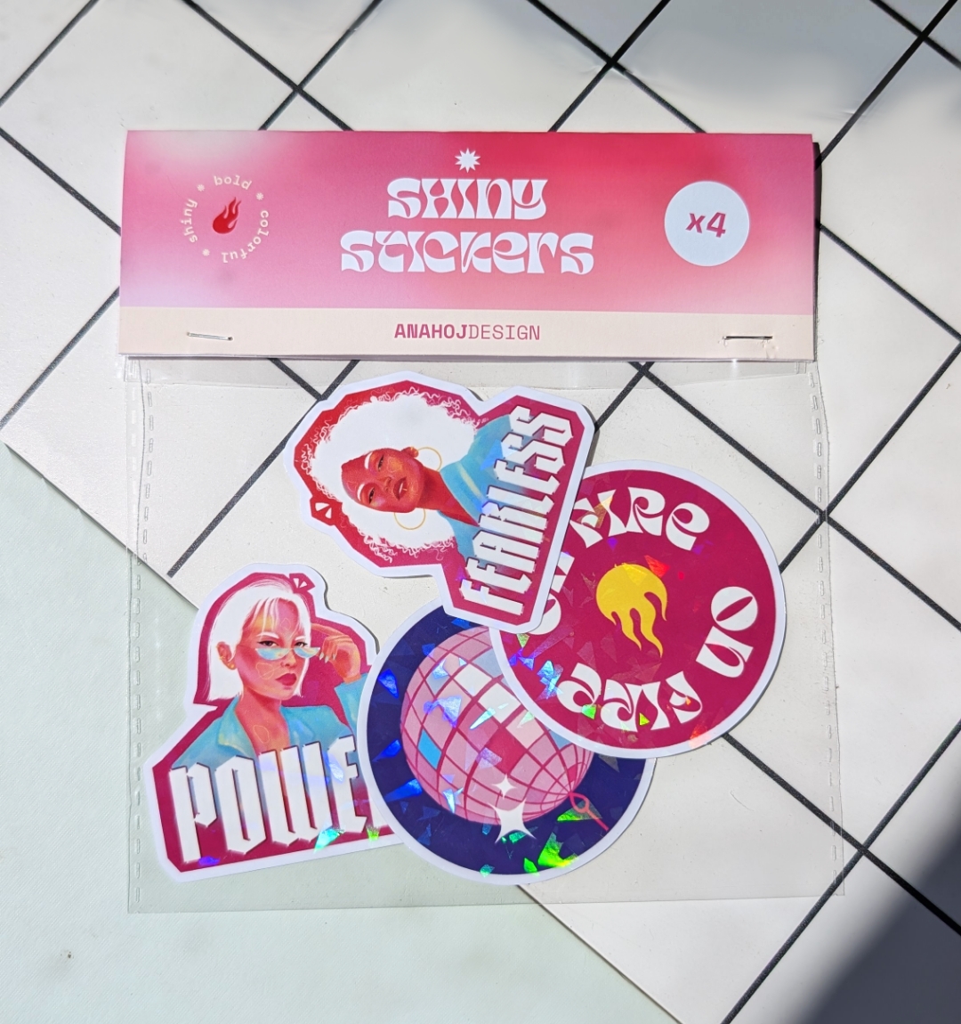 Un lot de 4 stickers de taille moyenne, qui brillent de mille feux grâce à leurs petits éclats holographiques. A coller sur un ordinateur, une coque de téléphone ou encore un carnet… à vous d’en décider !